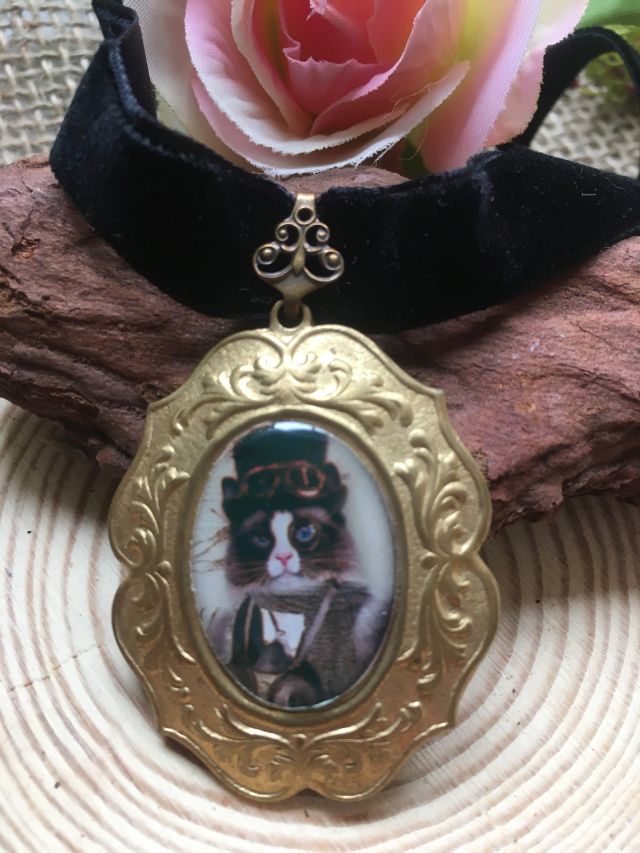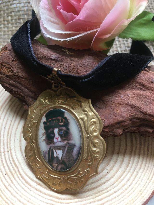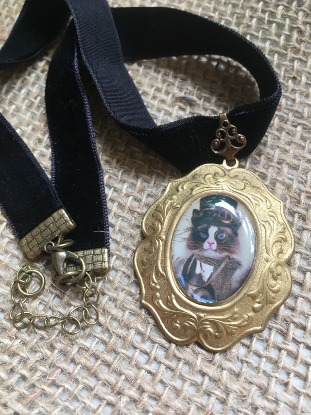 Gargantilla con imagen de caballero gatuno estilo steampunk protegida por resina transparente, base de latón dorado vintage, fornituras bronce y cinta de terciopelo negro.