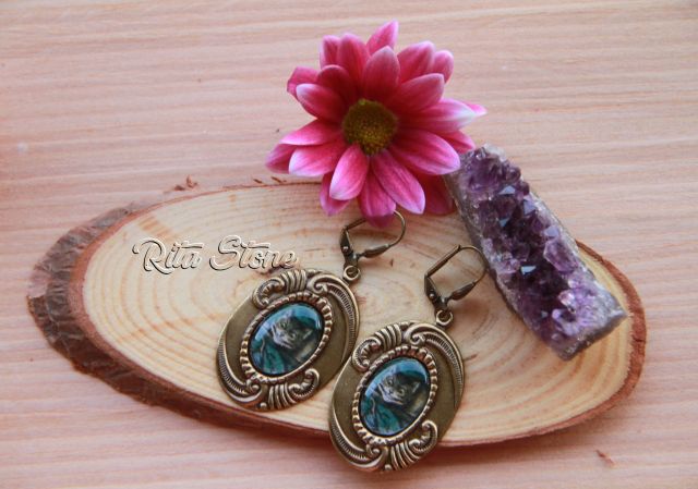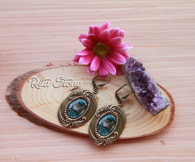 Pendientes de latón bronce, imagen del gato Cheshire (Alicia en el país de las maravillas) protegida por resina transparente.
