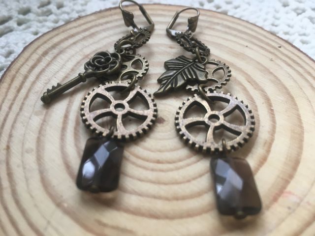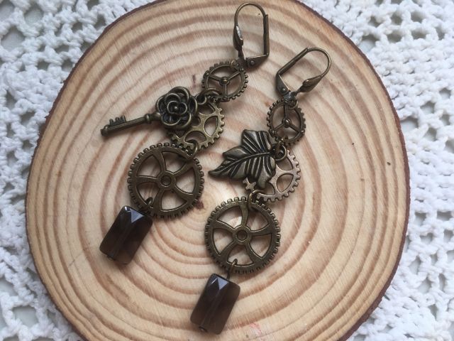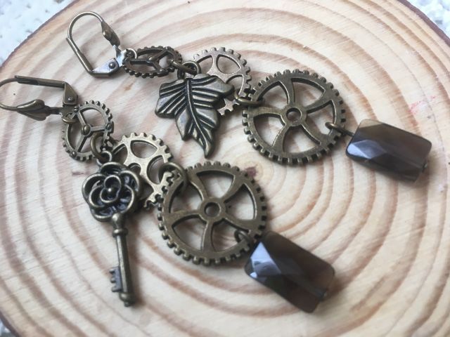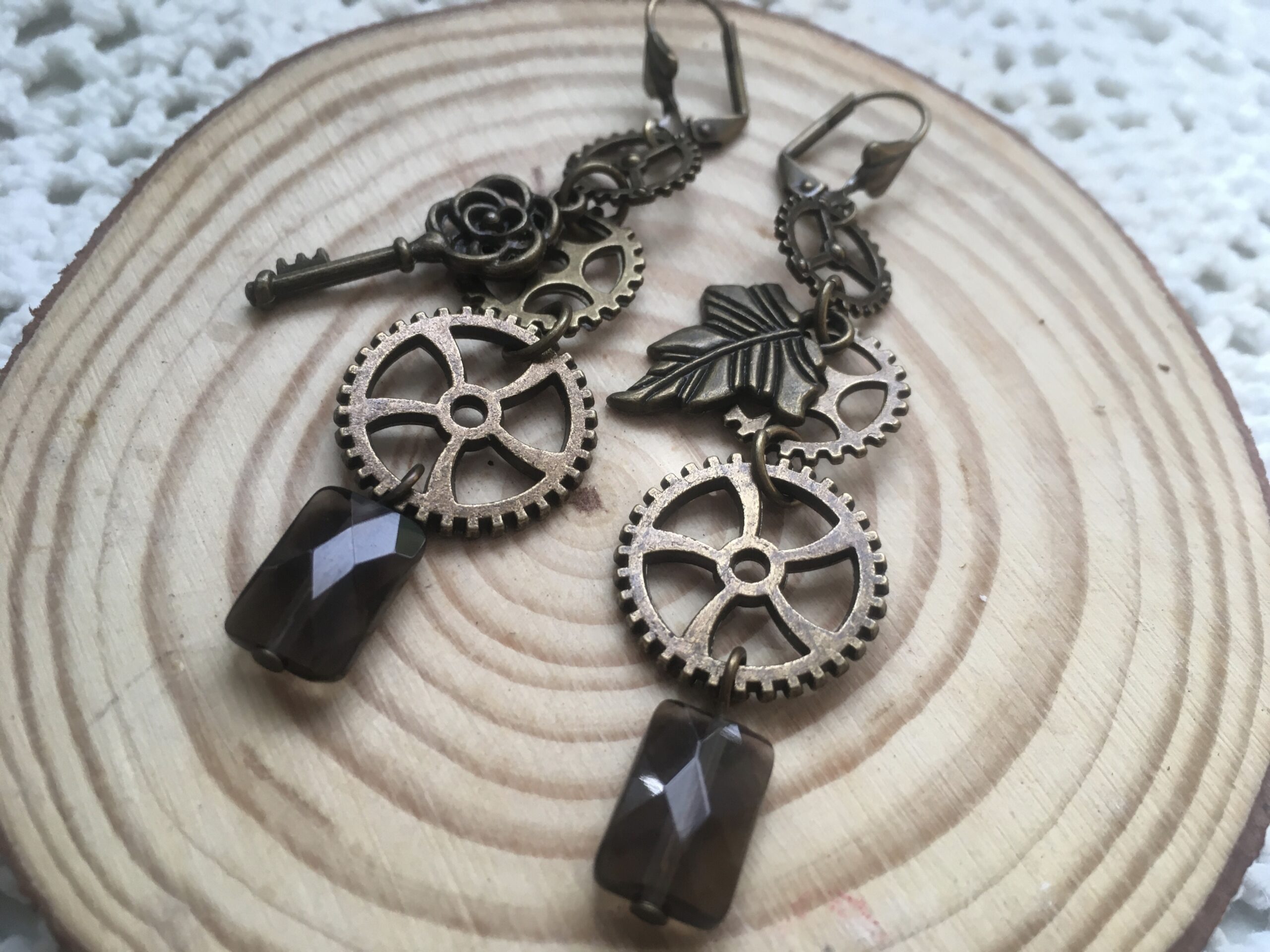 Pendientes elaborados en latón bronce, con abalorios y engranajes metálicos y cristales de cuarzo ahumado facetados.